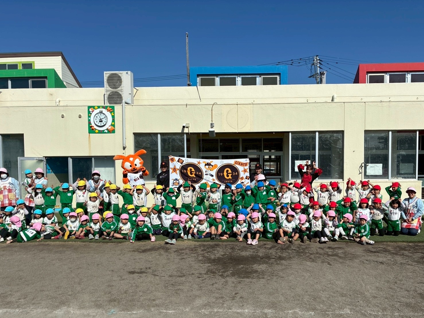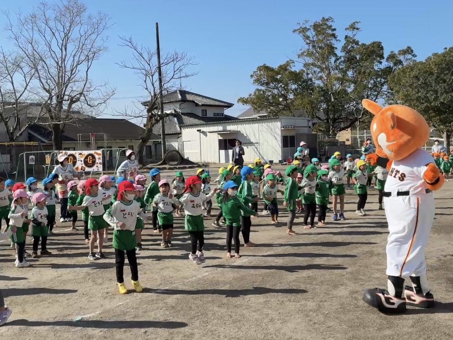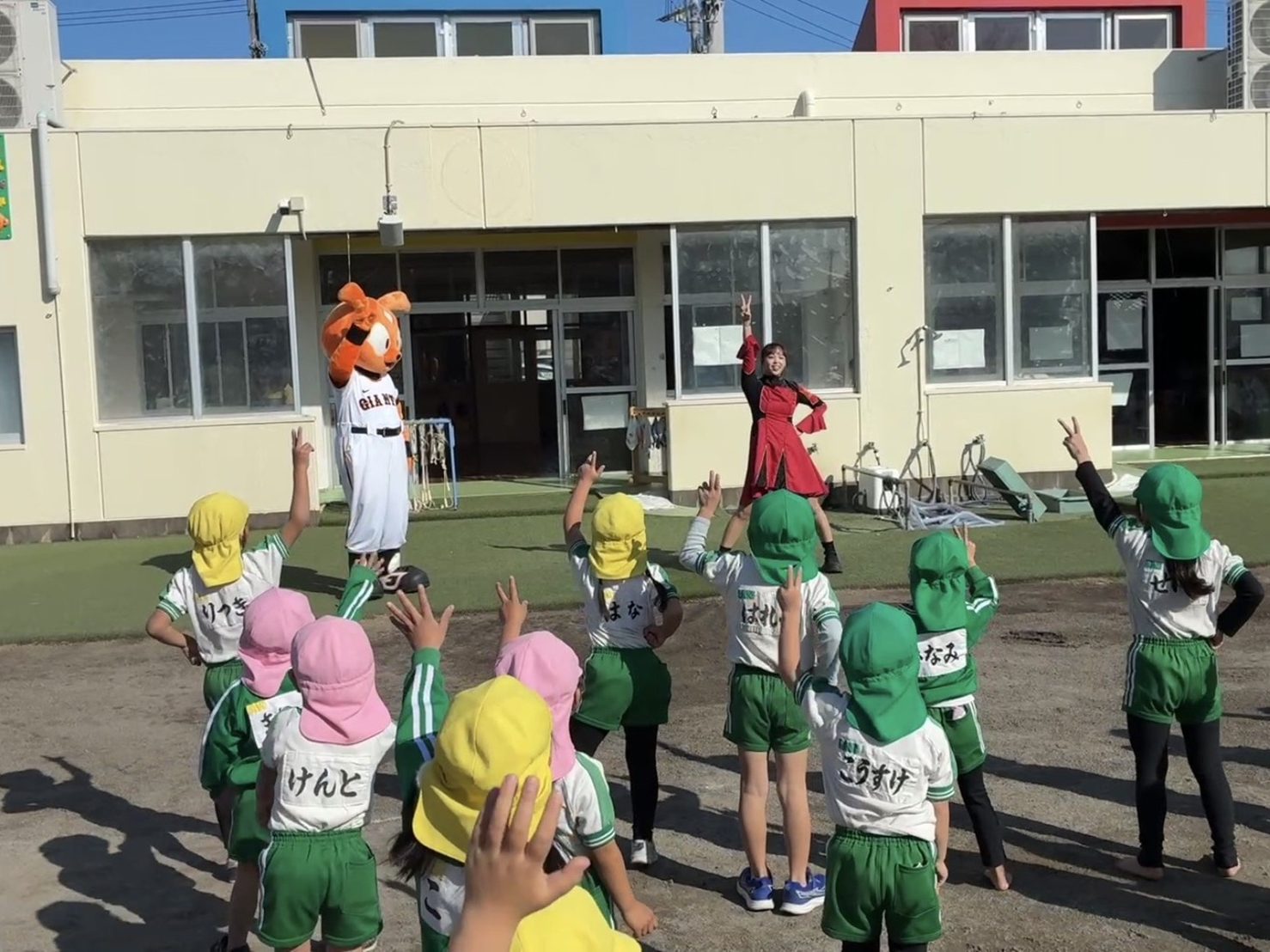 巨人初のオリジナルソング「じゃびっとそんぐ」に合わせて、「じゃびジャビダンス」を教えていただき、子どもたちは音楽に合わせて楽しみながら踊り、元気いっぱいの笑顔を見せてくれました。